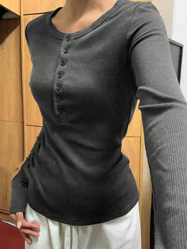 Einfarbiger, gerippter, langärmliger Strickpullover mit Knöpfen