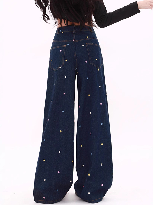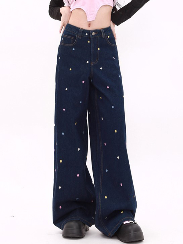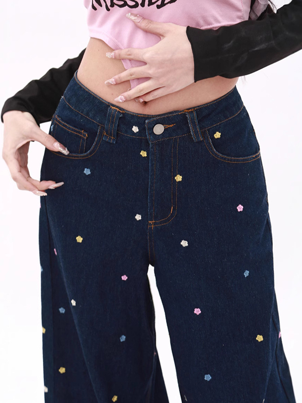 Dunkelblaue Retro-Boyfriendjeans mit Blumenstickerei