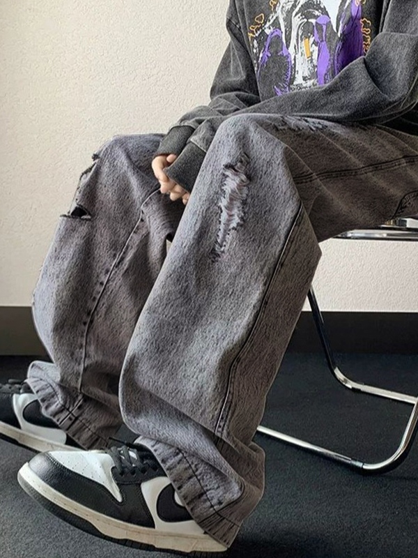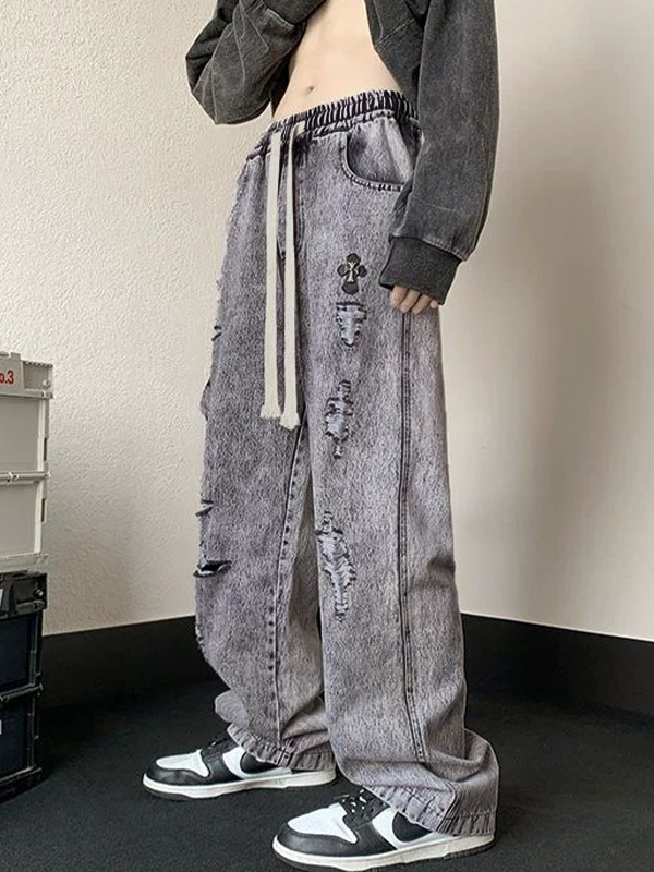 Lose Herrenjeans mit zerrissenem Kordelzug in grauer Waschung