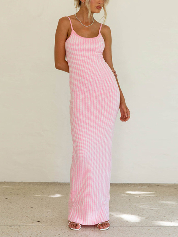 Retro-kariertes, rosafarbenes, schmal geschnittenes Maxikleid mit Hosenträgern