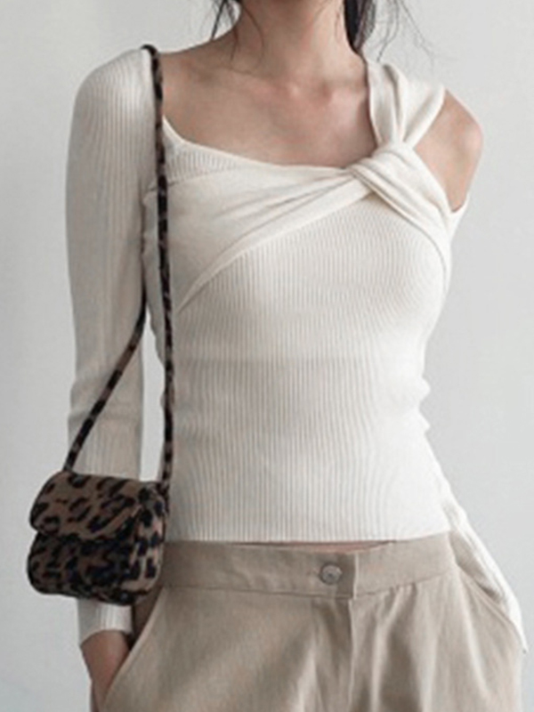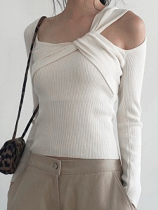 Verdrehter, asymmetrischer, schulterfreier Strick mit langen Ärmeln