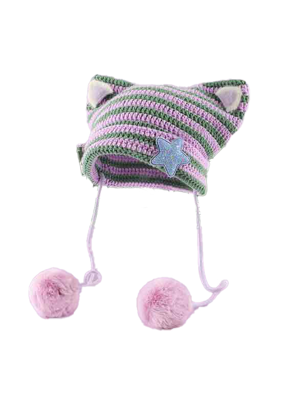 Gestreifte Beanie-Mütze im Katzen-Design