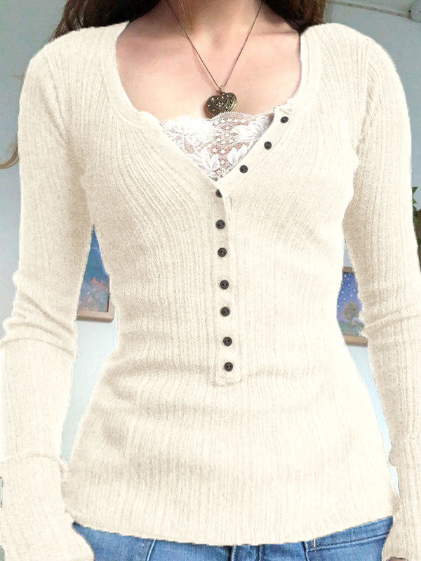 Langärmliges Stricktop mit Spitzeneinsatz und Knöpfen