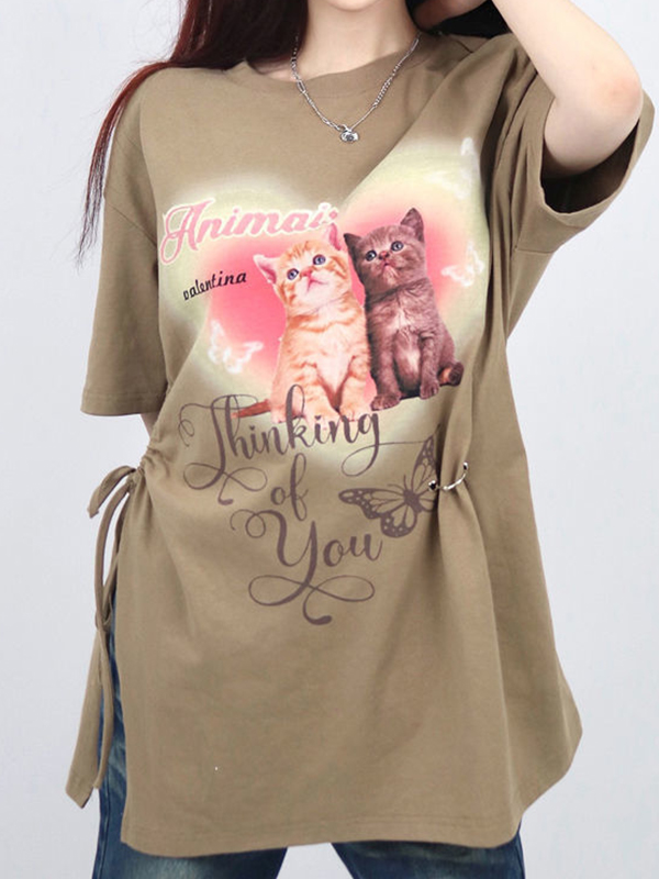 Übergroßes kurzärmliges T-Shirt mit Katzen-Print und Kordelzug