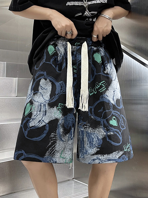 Herren-Shorts mit unregelmäßigem Cartoon-Bär-Print und Kordelzug