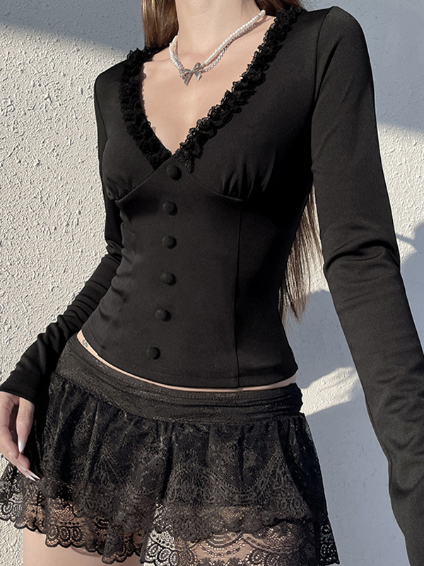 Langärmliges T-Shirt mit V-Ausschnitt und Spitze